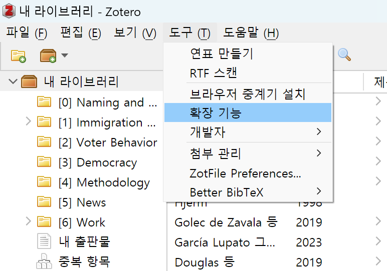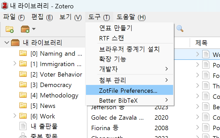 - Zotfile 설치가 끝났다면, 최초 설정을 해줄 차례이다. <도구> → <Zotfile Preference>로 들어간다.