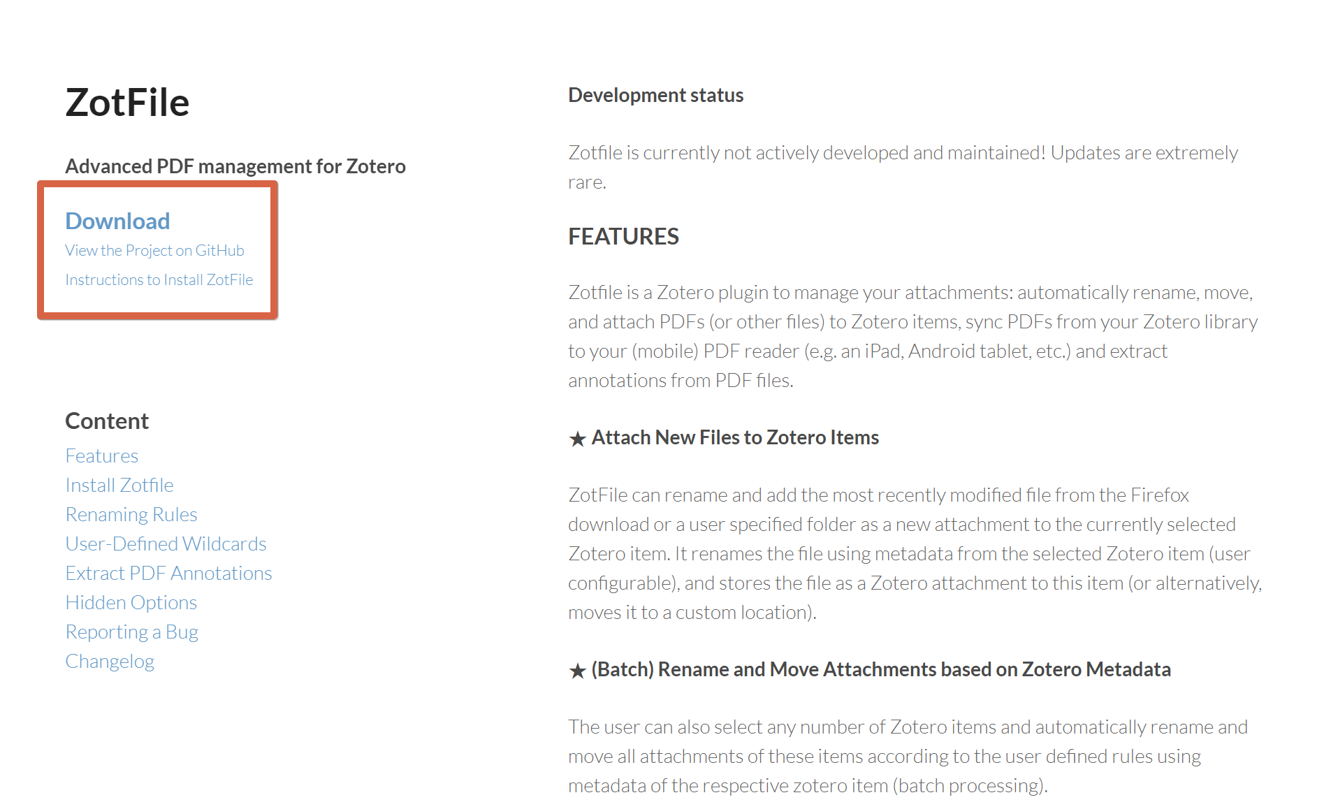 - 이제 Zotfile을 설치한다. Zotfile 사이트에 접속해 다운로드한다. 파일형태가 <xpi> 형식일 것이다.