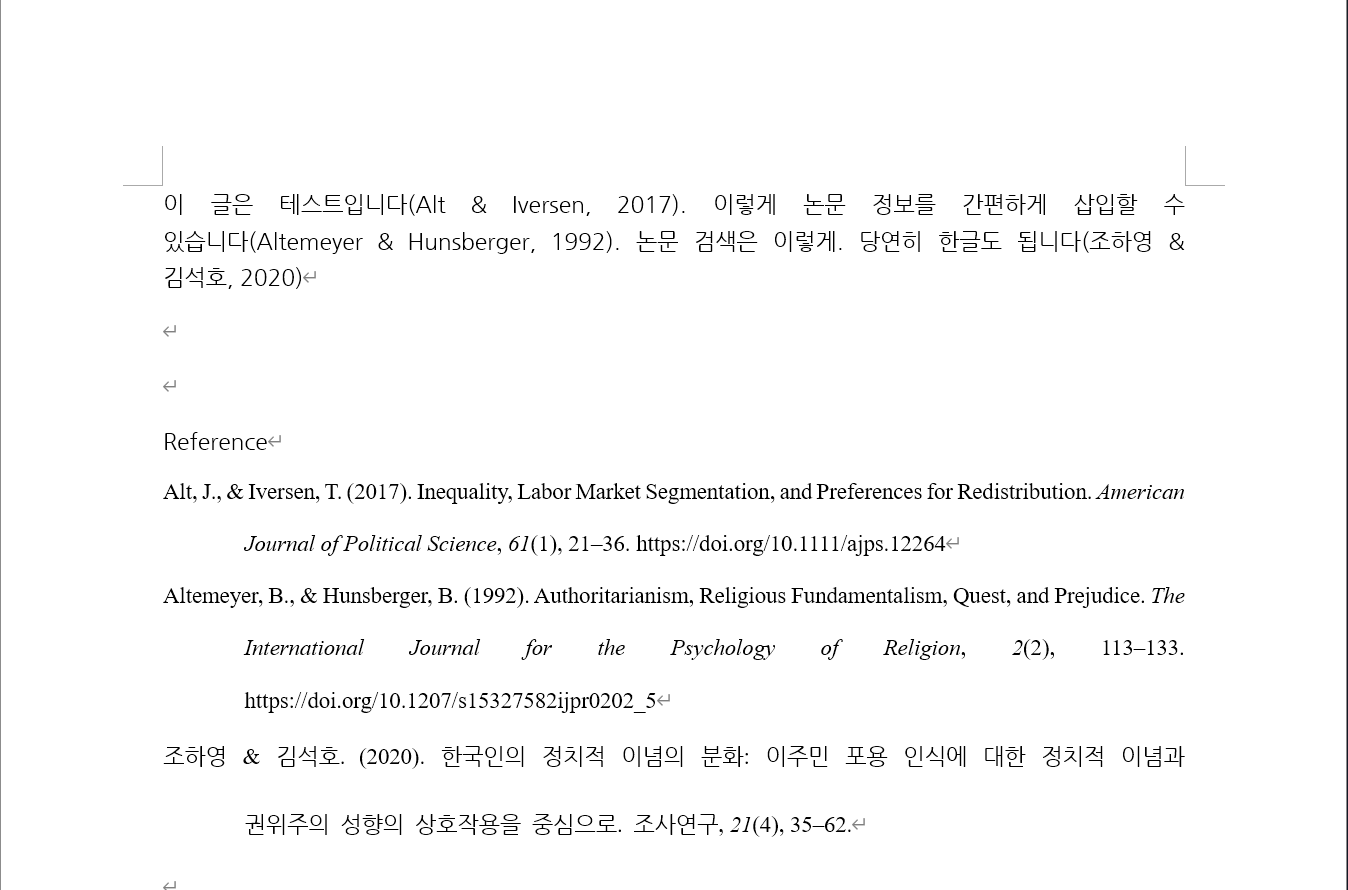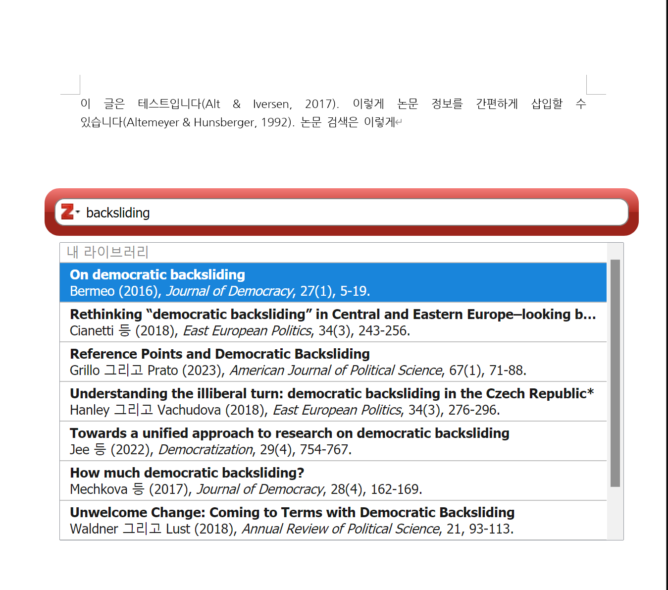 - Zotero는 EndNote, Mendeley와 함께 대표적인 서지관리 프로그램으로써, 논문 관리를 쉽게 할 수 있을 뿐만 아니라 논문 작성 시 인용 정보를 자동으로 삽입할 수 있도록 도와준다. 예를 들어, 본문에 (아무개, 2024)라는 인용을 넣었다면 맨 마지막 Reference 항목에 자동으로 논문 정보를 넣어주는 식이다.