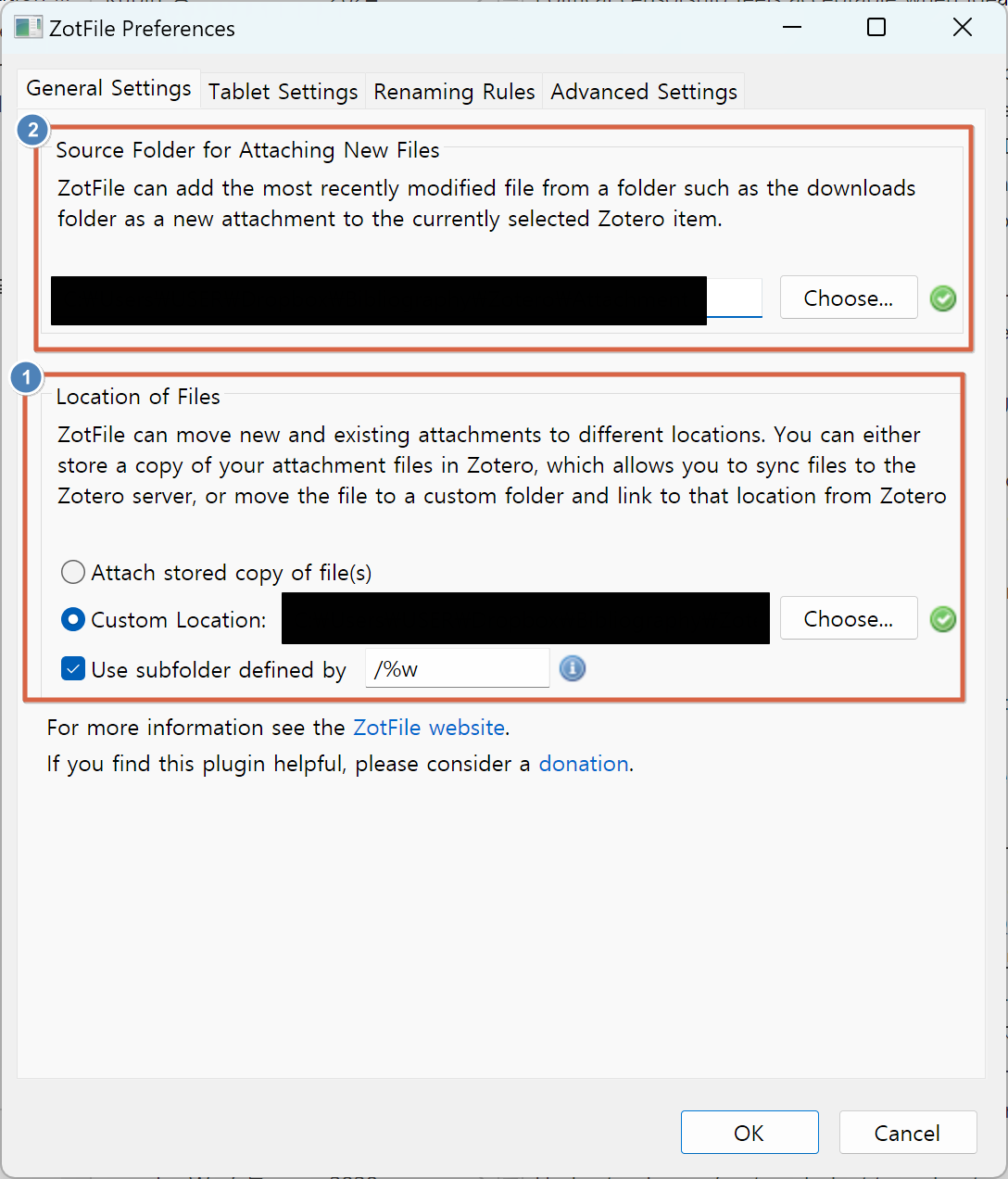 - 아래 “Use subfolder defined by” 항목은 체크해두는 것을 추천. 논문을 Zotero에 던져두면 해당 저널 이름별로 논문을 모아주는 역할을 한다.