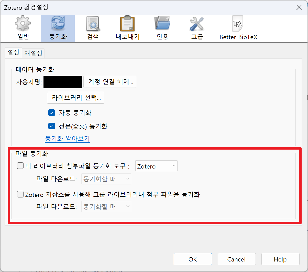 - 클라우드 연동을 위해 상단 <편집> → <환경설정> → <동기화>로 이동해 ‘파일 동기화’ 부분에 모두 체크 해제한다. 만약 여기에 체크되어 있다면 Zotero는 웹 저장소에 지속적으로 첨부파일을 동기화할 것이다. 그러면 기본제공 300MB를 금방 사용하게 된다.