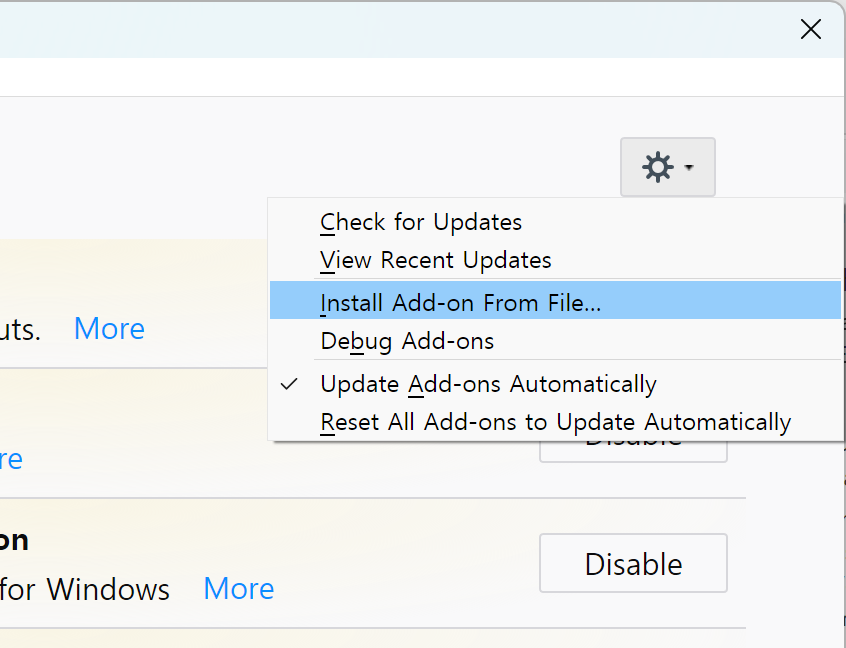 - 우측 상단 톱니바퀴를 클릭, <install Add-on From File>을 클릭해 다운로드 받은 xpi 파일을 열어주면, 설치가 시작된다.
