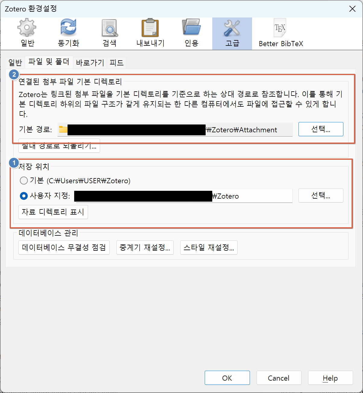 - 먼저 <저장 위치> 탭에서 “사용자 지정”을 선택, 자신이 Base 폴더로 사용할 경로로 지정한다. 앞으로 Zotero에 저장될 서지정보, Citation Key와 같은 인용 정보는 이 폴더에 저장될 것이다.