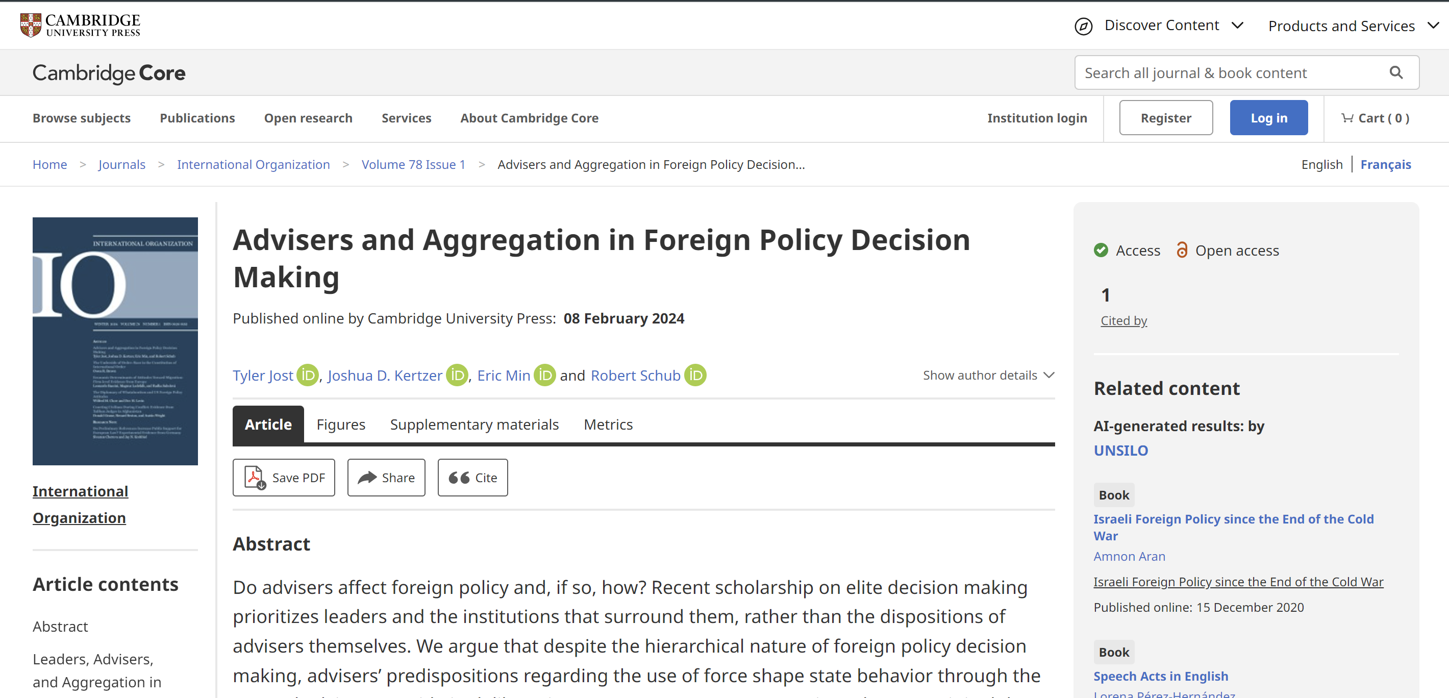 - Zotero 사용법은 매우 간단하다. 먼저 저장을 원하는 논문 사이트를 접속한다. 여기서는 예시로 <International Organization>의 Open Access 논문을 들어갔다.