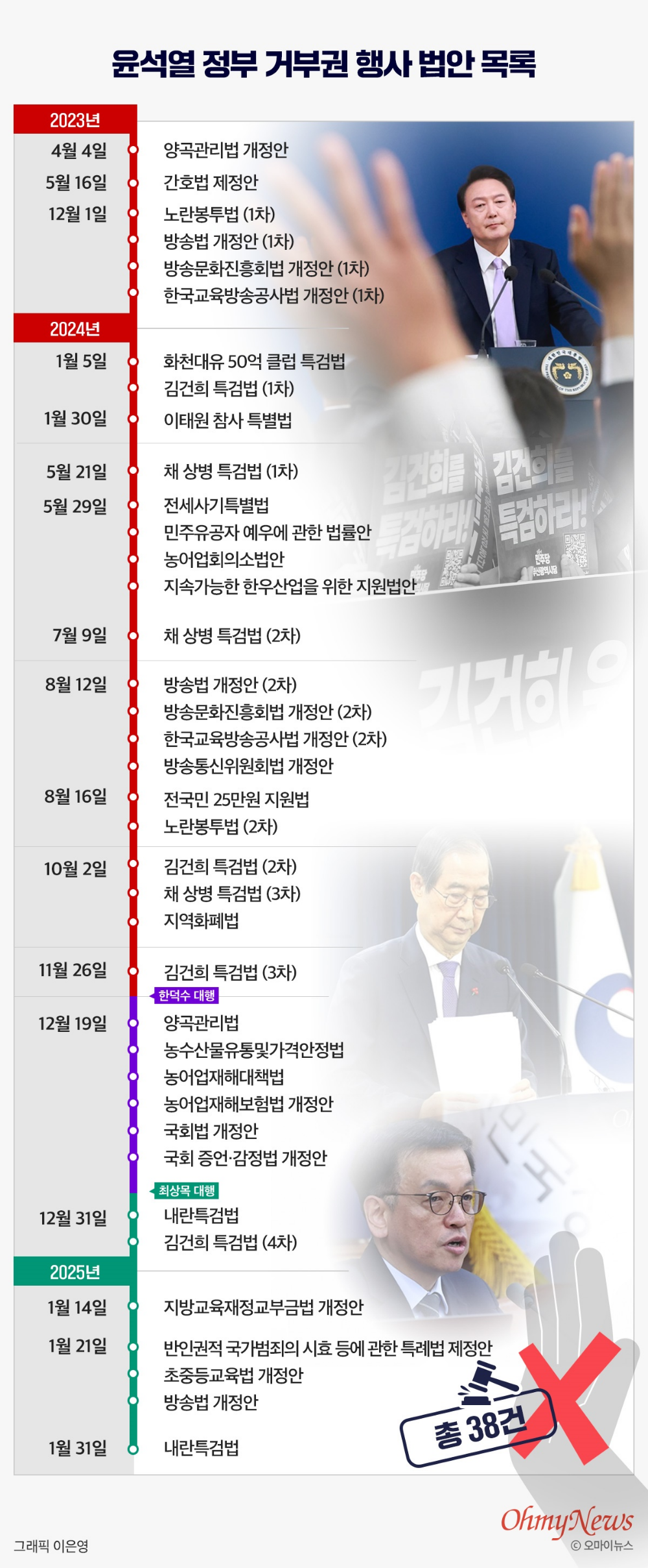 반대로 윤석열의 거부권은 재임기간 동안 ‘25번’ 행사되었다. 한덕수, 최상목까지 더하면 그 횟수는 38번에 육박하고, 최상목은 ‘권한대행’으로서는 최초로 9번째 거부권을 행사했다. 역대 대통령 중 이승만을 제외하면 가장 많은 거부권 행사 숫자이다. 심지어 해당 거부권은 자신에게 정치적으로 불리하기 때문에 거부한 것으로 의심되는 사례도 다수 포함되어 있다. 국회에서 수정 및 재의결을 거쳤음에도 반복해서 거부권을 행사한 사례 또한 존재한다. 예를 들어 채 상병 특검법이나 김건희 특검법 같은 경우가 대표적이다. 때때로 정부발의안까지 거부한 사례도 있기도 하다. 대통령의 거부권이 민주당의 독단으로 처리된 법안들이라는 주장도 하던데, 이는 절반만 맞는 사실로 확인됐다. 실제로는 정부 발의 법안을 반대한 경우도 있고, 국민의힘에서 찬성 표결을 던진 법안 또한 존재한다.