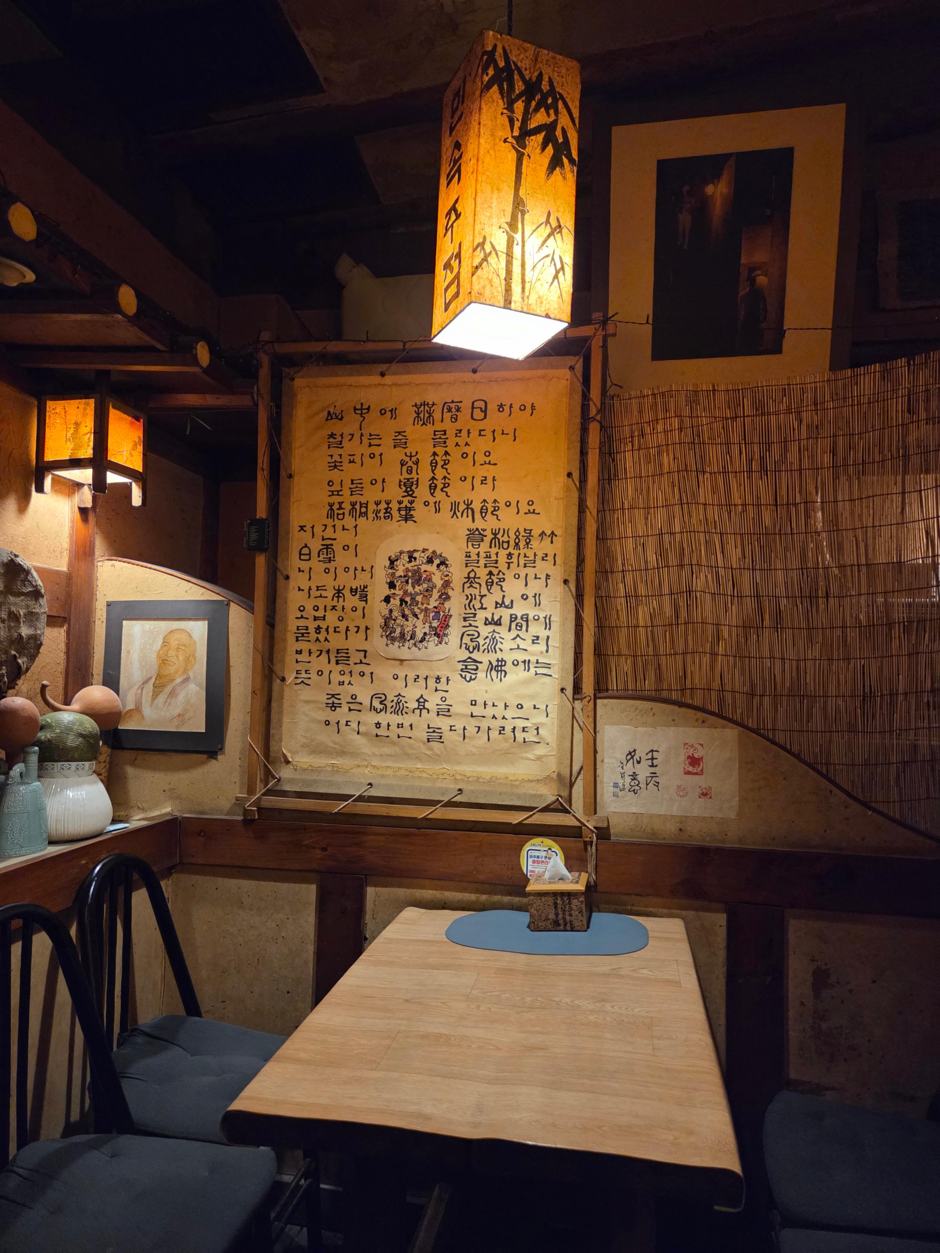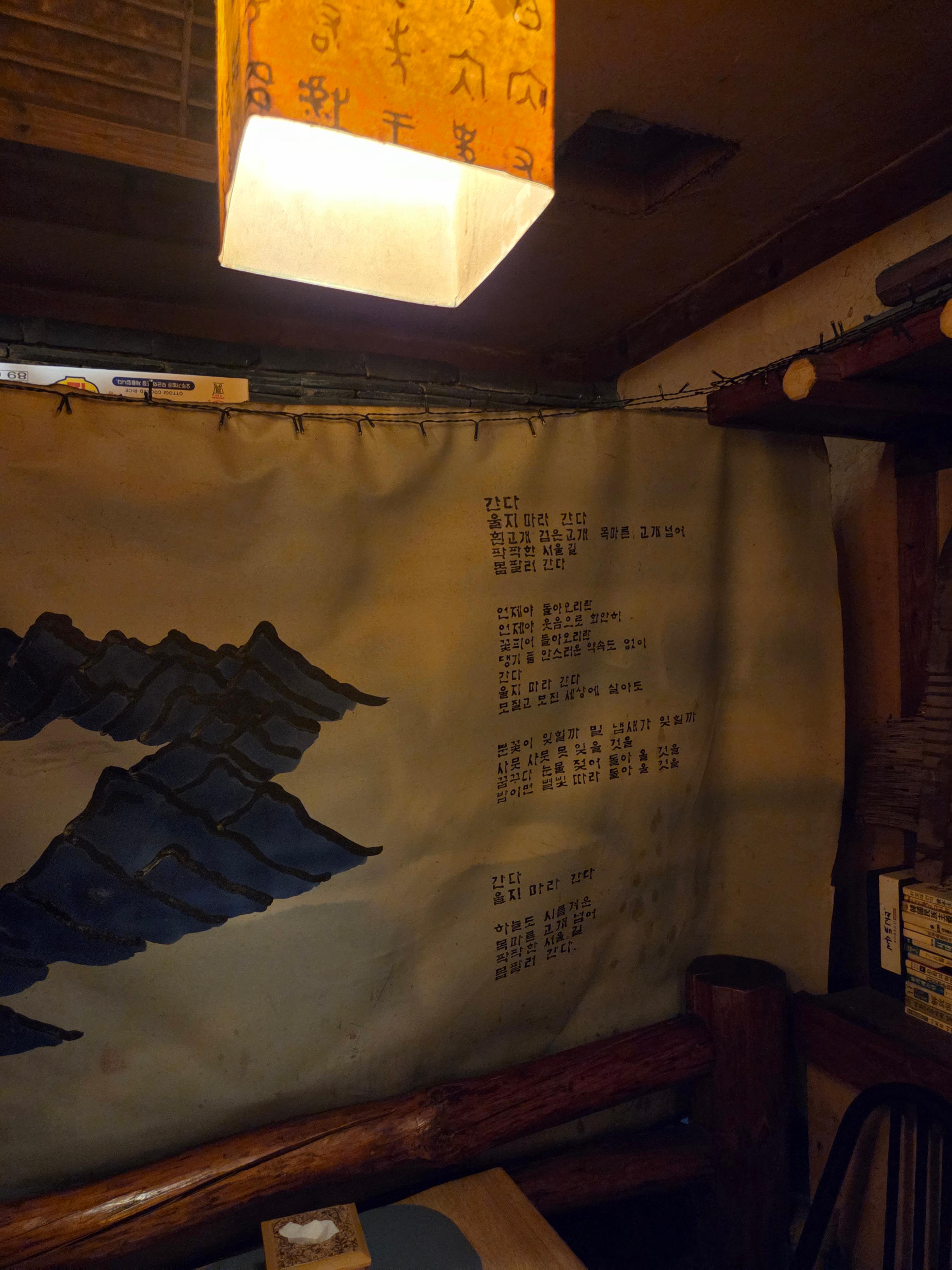 우리가 가게 되면 꼭 앉는 자리가 있다. 무대처럼 살짝 올라온 마루 바닥에 테이블 3개가 있는데, 그중 중앙자리가 우리가 자주 앉는 자리다. 나는 늘 가장자리에 앉았다. 특별히 의도한 것은 아니지만, 무대 벽면에 붙어있는 시를 좀 더 자주 보게 되는 효과는 있다. 무대 이름은, <흰 노래 검은 소리>인 것 같다. 종종 공연도 했다고. 윤석열이 탄핵되던 날 밤, 사장님은 이곳에 무대를 열었다고 했다. 탄핵안 가결부터 파면까지는 너무 긴 겨울이 있었다.