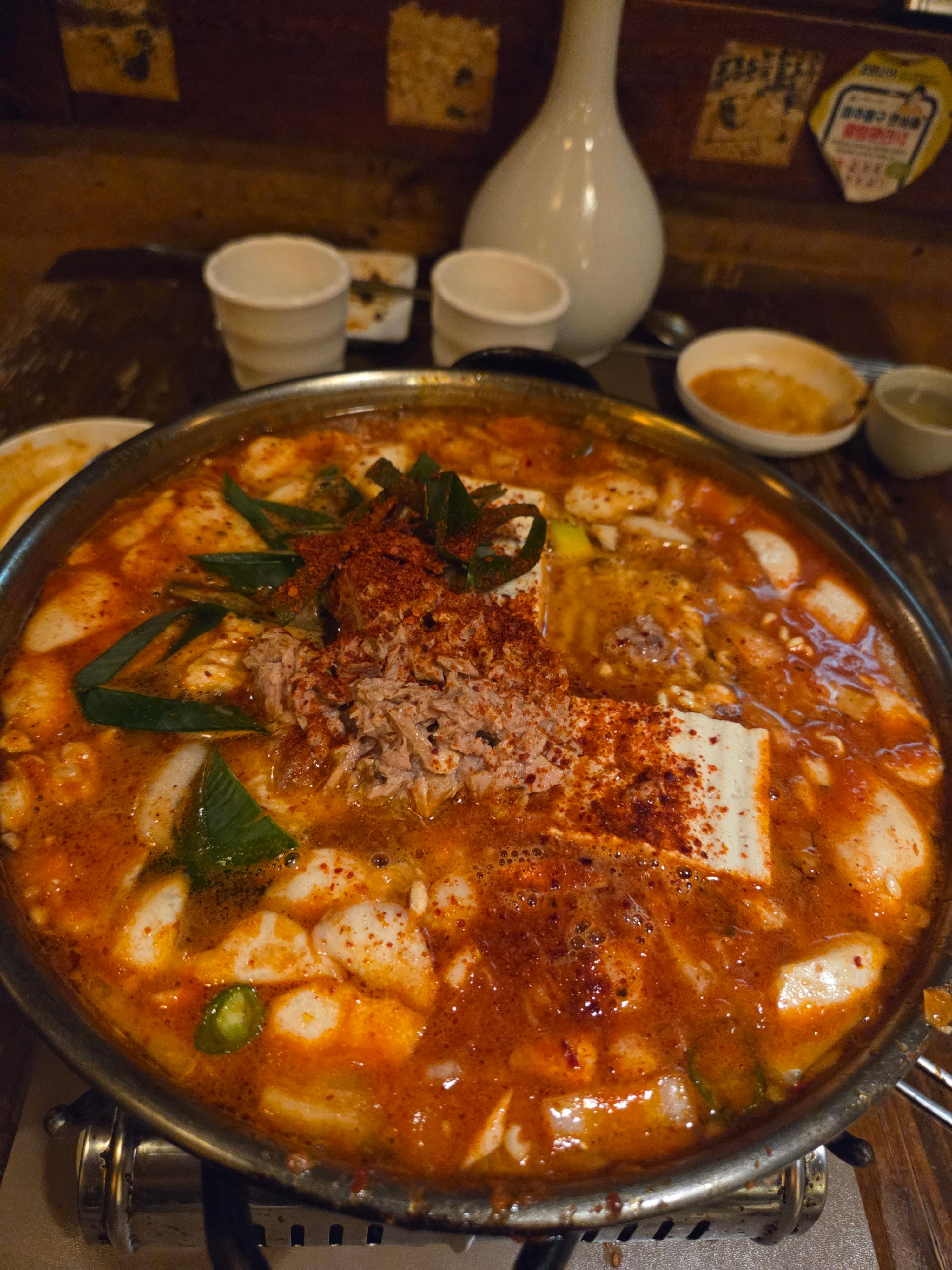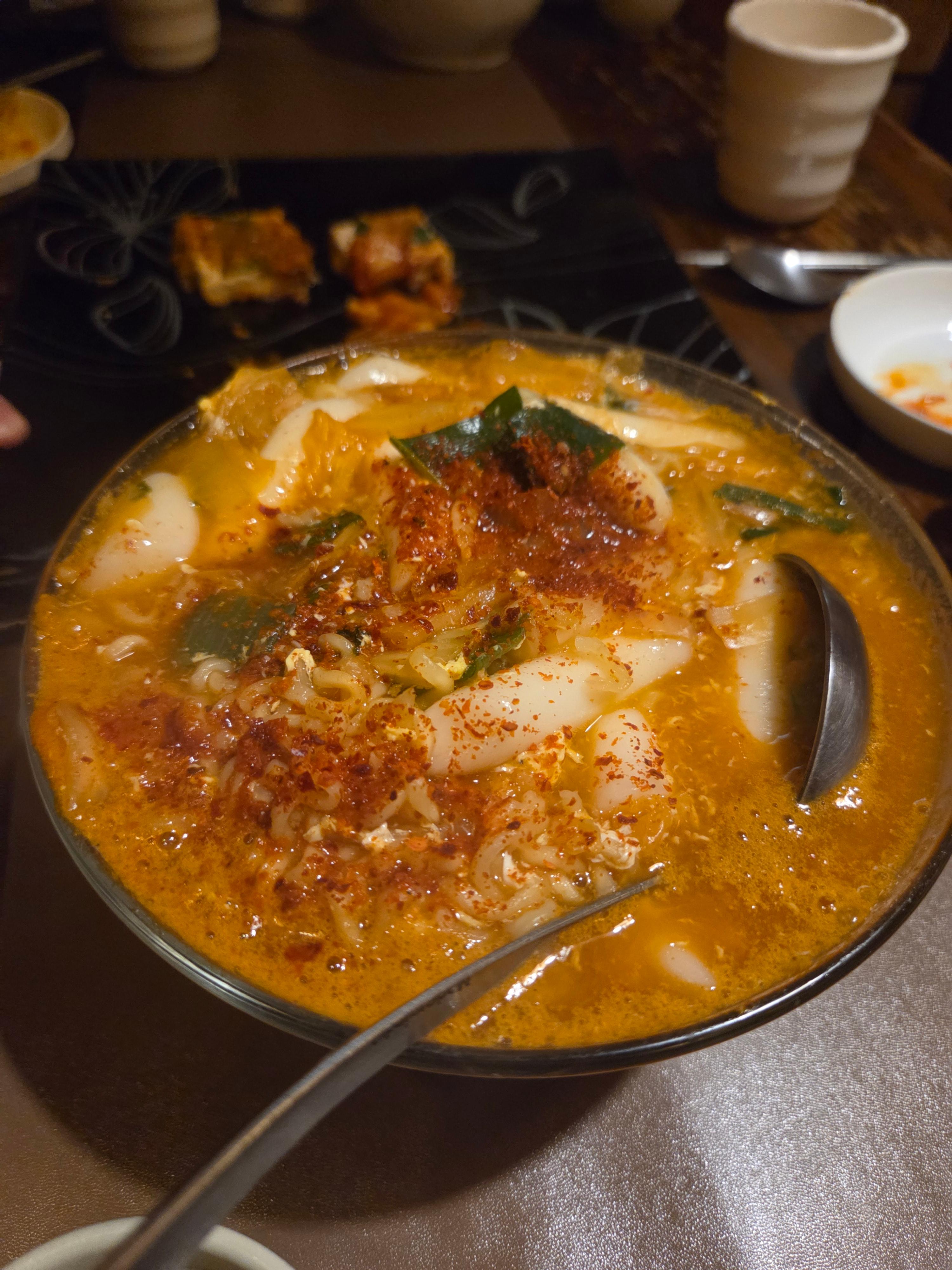 얼큰한 국물을 먹으려고 참치김치찌개도 시켰다. 순두부와 참치가 들어간 얼큰한 찌개다. 워낙 단골이다 보니, 사장님이 종종 서비스를 주시는데, 이번 서비스는 떡라면이었다.
