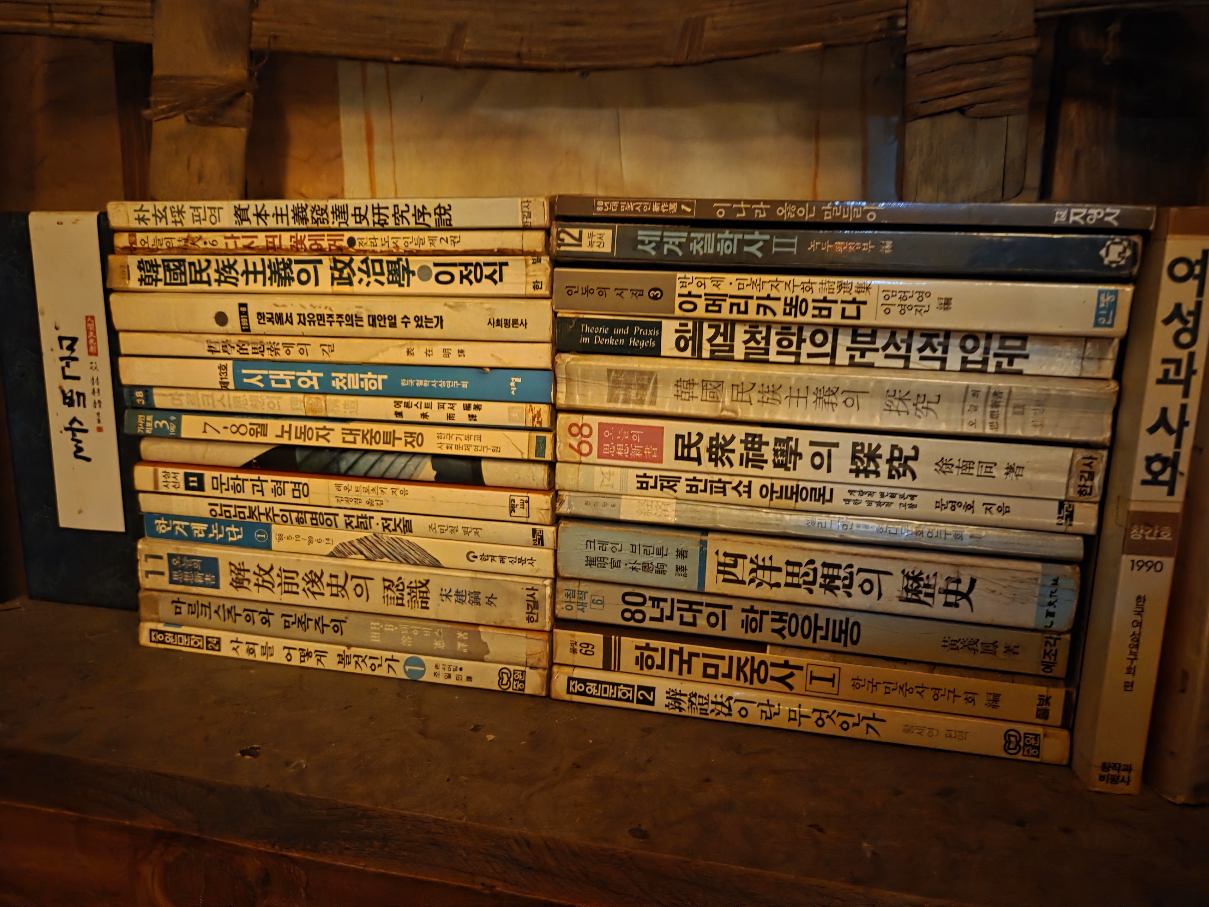 가게 한 편을 장식하고 있는, 학생운동사의 절정을 보여주는 대목이다. 지금은 전혀 구할 수 없는 책들이다. 노동자 대투쟁, 사구체 논쟁, 헤겔철학, 세계철학사, 반제반파쇼 등... 온갖 이론과 논쟁이 불붙으며 각축했던 학생운동 세계의 역사를 압축한 공간이다.